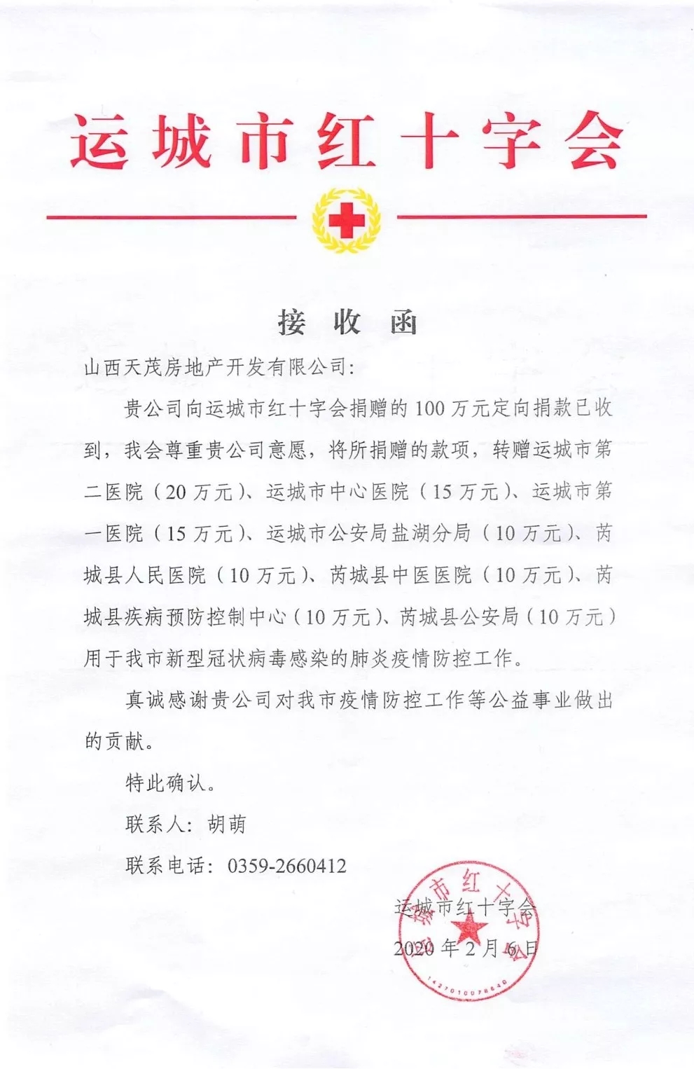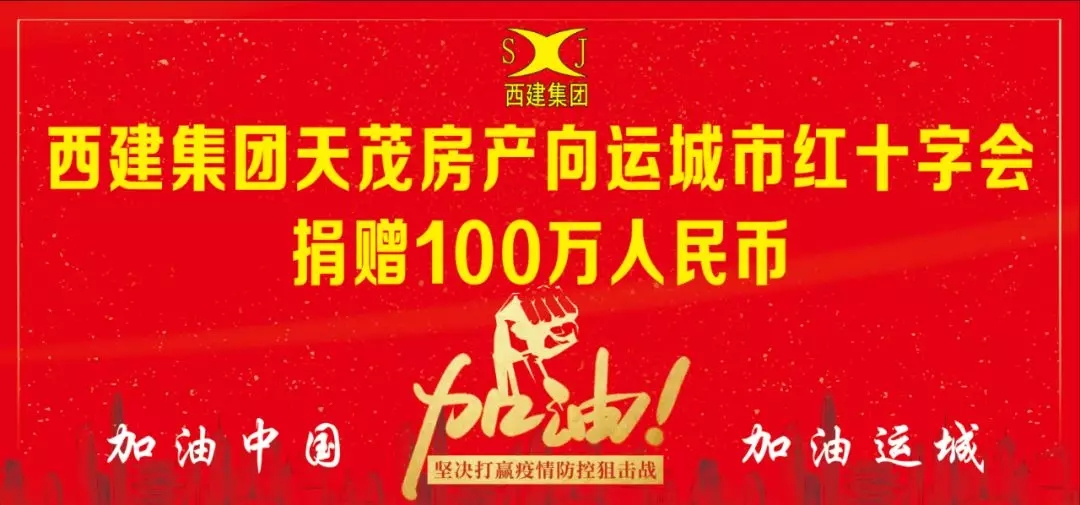 為了抗擊疫情、共渡難關(guān),西建集團(tuán)天茂房產(chǎn)通過運(yùn)城市紅十字會(huì)向“運(yùn)城市第二醫(yī)院(20萬元)、運(yùn)城市中心醫(yī)院(15萬元)、運(yùn)城市第一醫(yī)院(15萬元)、運(yùn)城市公安局鹽湖分局(10萬元)、芮城縣人民醫(yī)院(10萬元)、芮城縣中醫(yī)醫(yī)院(10萬元)、芮城縣疾病預(yù)防控制中心(10萬元)、芮城縣公安局(10萬元)”共捐贈(zèng)人民幣100萬元,用于我市新型冠狀病毒感染的肺炎疫情防控工作和其他公益事業(yè)。
