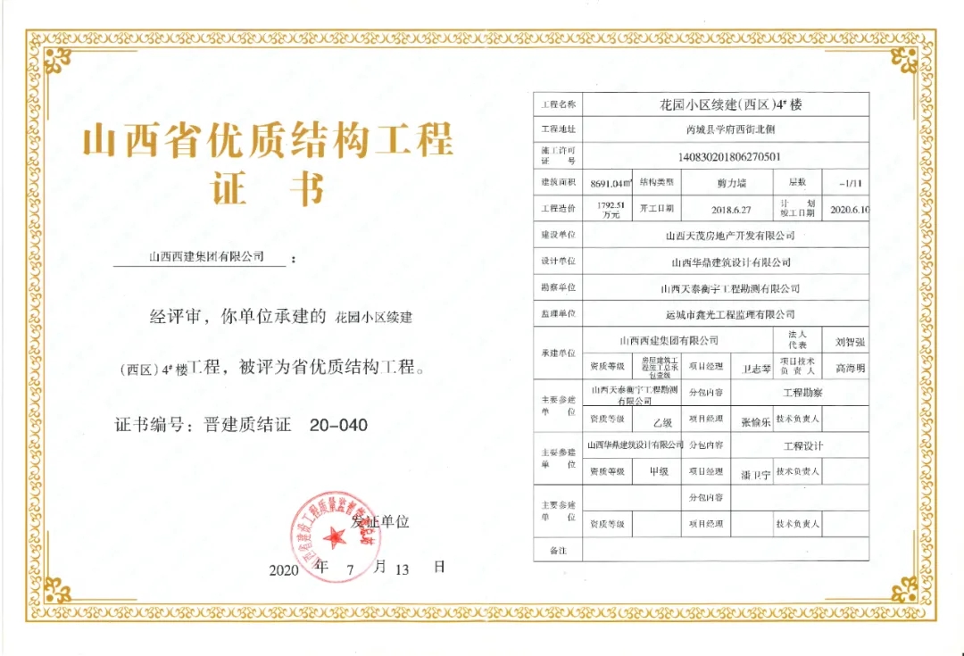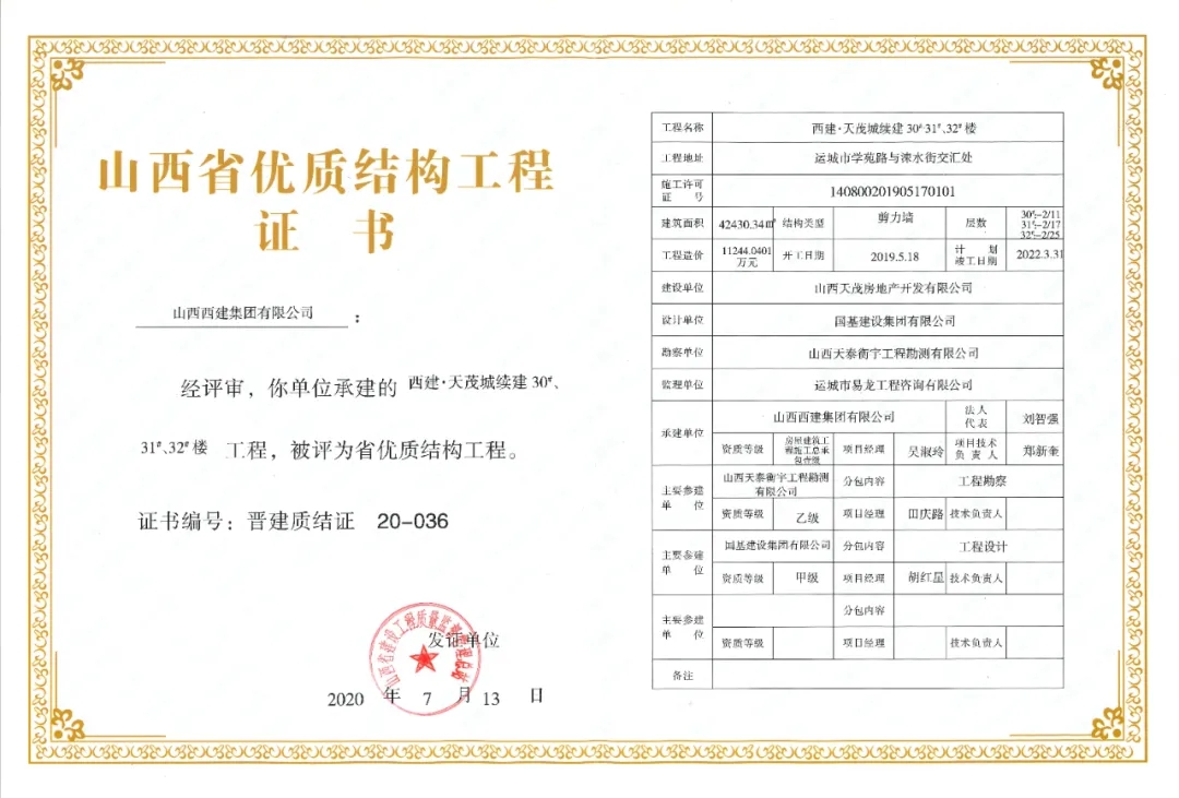 摘要:日前,山西省建設(shè)工程質(zhì)量監(jiān)督管理總站公布2020年第一批山西省優(yōu)質(zhì)結(jié)構(gòu)工程名單,其中:山西西建集團有限公司承建的西建·天茂城續(xù)建30#、31#、32#樓,新絳縣新城幼兒園,西建·金茂華府二期6#、10#樓,福苑西區(qū)3#樓,花園小區(qū)續(xù)建(西區(qū))4#樓,西建·天茂上郡1#,西建·天茂上郡3#樓7項工程同獲“山西省優(yōu)質(zhì)結(jié)構(gòu)工程”。