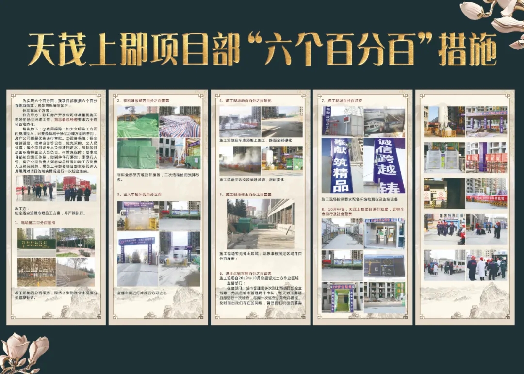 為實(shí)現(xiàn)六個(gè)百分百,天茂上郡項(xiàng)目部根據(jù)六個(gè)百分百逐項(xiàng)落實(shí),公司非常重視施工現(xiàn)場(chǎng)的揚(yáng)塵治理工作,劉忠森總經(jīng)理要求六個(gè)百分百常態(tài)化,以及施工方制定揚(yáng)塵治理專項(xiàng)施工方案,并嚴(yán)格執(zhí)行。房產(chǎn)公司負(fù)責(zé)人劉忠森總經(jīng)理和施工方負(fù)責(zé)人衛(wèi)耀民副總,帶領(lǐng)工程部和項(xiàng)目部主要管理人員每周都會(huì)對(duì)項(xiàng)目的落實(shí)情況進(jìn)行一次檢查落實(shí)。