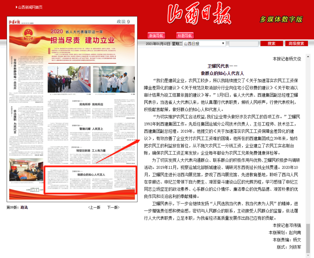 《山西日報》刊登——省人大代表、西建集團副總經理衛耀民《做群眾的知心人代言人》