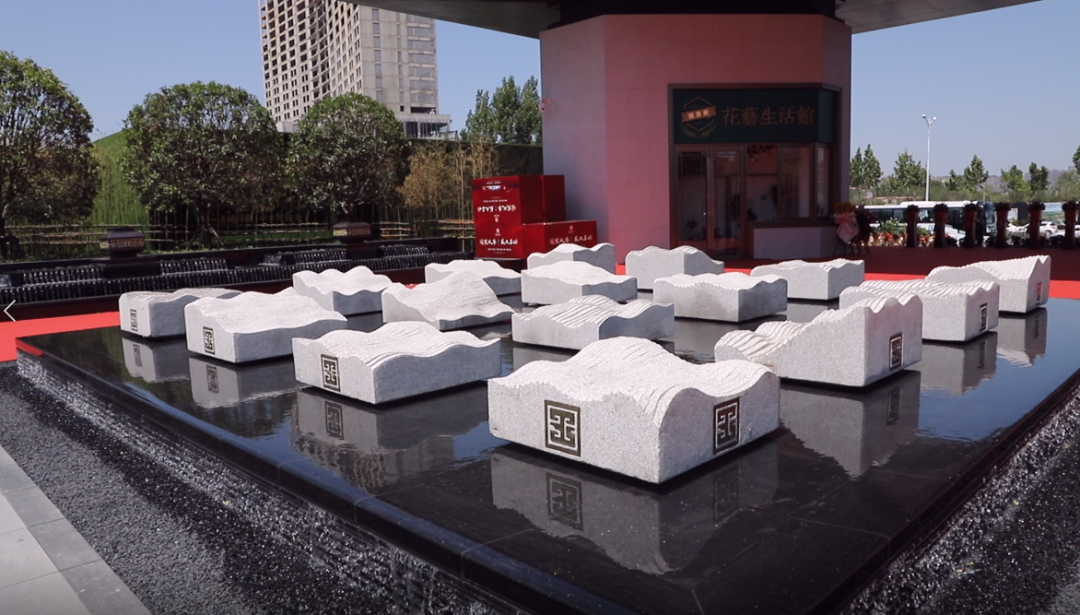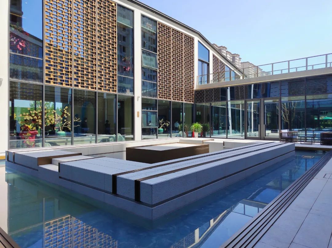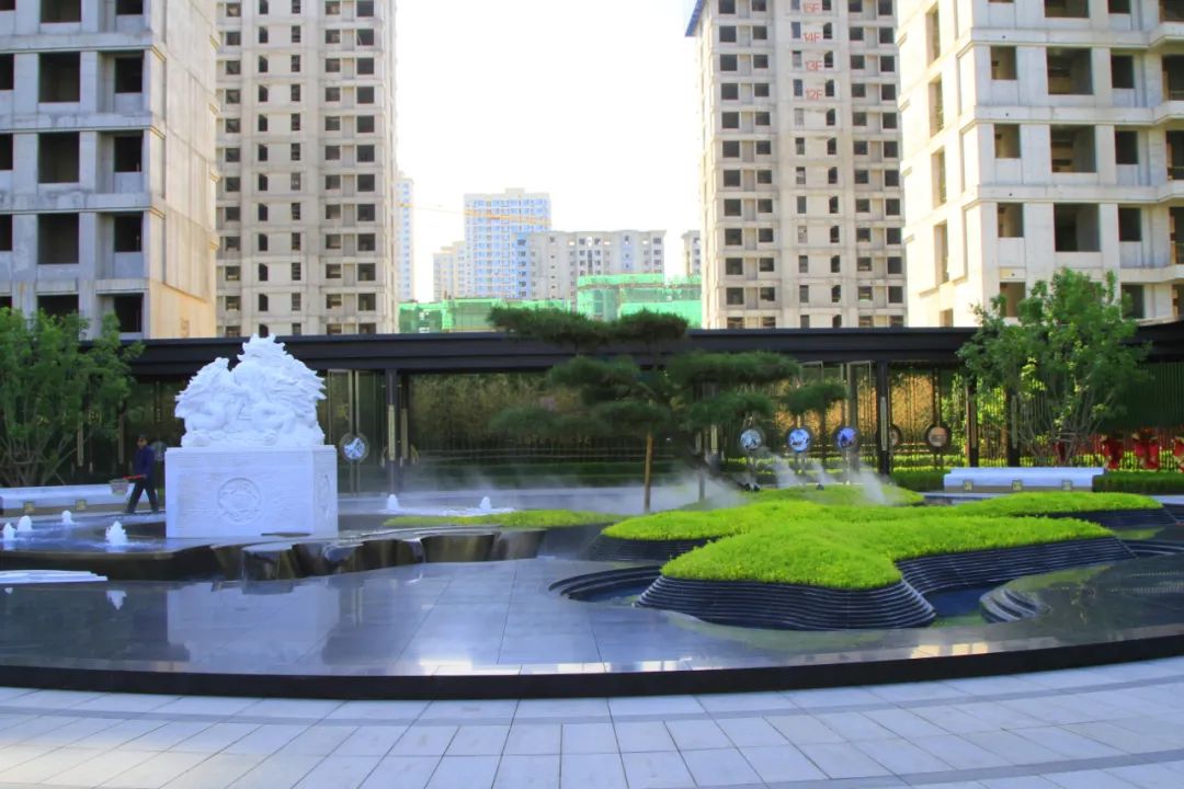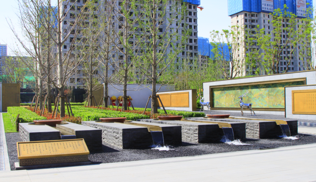 坐落在歷史景觀長軸與和軸的十字交叉點,水景以黑金砂鋪設,呈現出字樣式,池底為景泰藍石材,與周邊不銹鋼流水缽、漢白玉玉璽、造型迎客松等連成一體;從高空俯瞰看,它像是印章一樣印在我們國賓府的中心,寓意國賓府業主家和萬事興。
