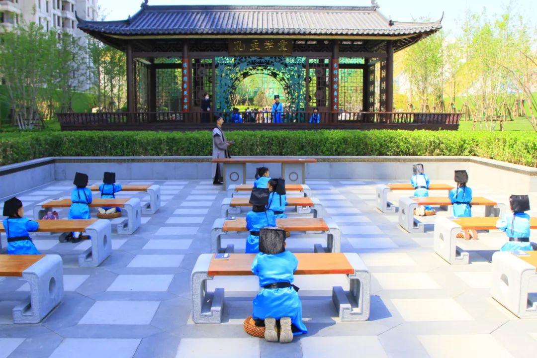 踏入學堂走到書案,映入眼簾是勸學和中庸的書卷雕塑,隔岸可以看到孔孟學堂亭,整個氛圍猶如孔子講學的場景。表達了西建國賓府對小業主們長大成龍成鳳的美好愿景。