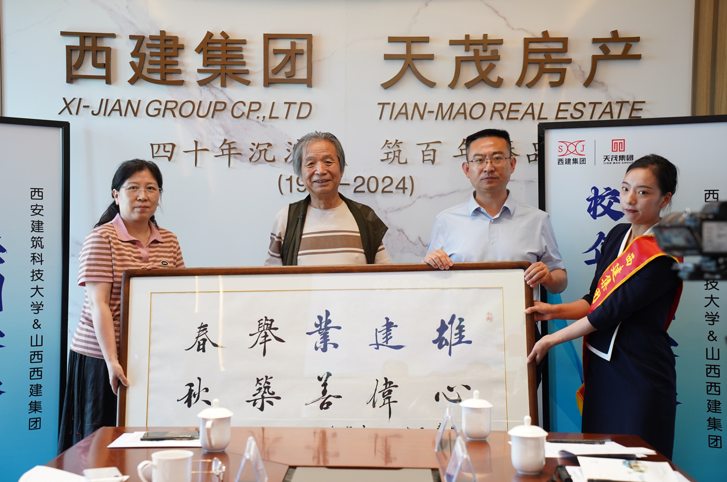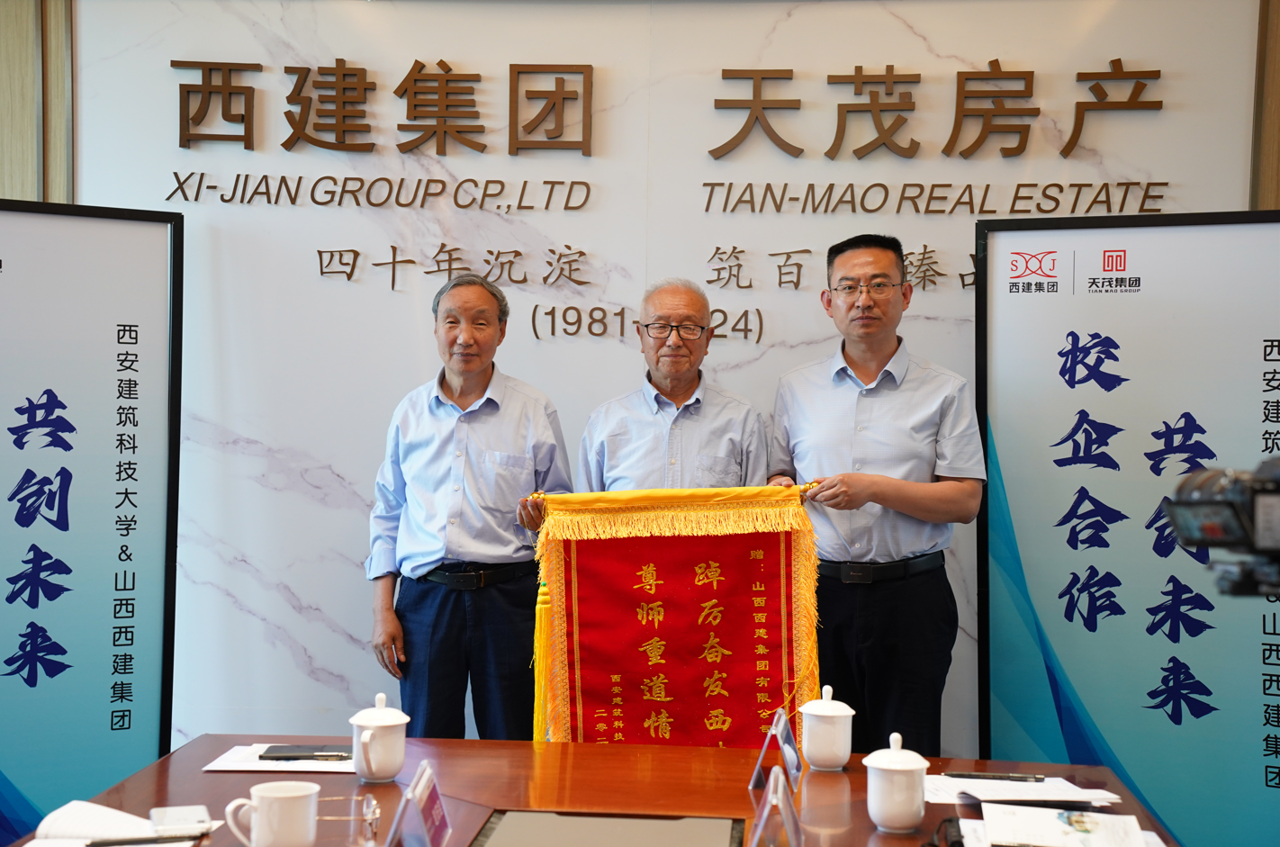西安建大老教授協(xié)會會長王齊銘、西安建大老教授協(xié)會秘書長趙安啟為西建集團送予錦旗